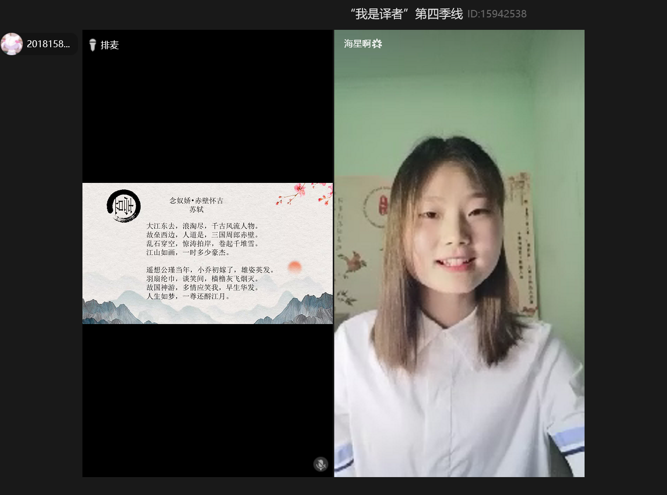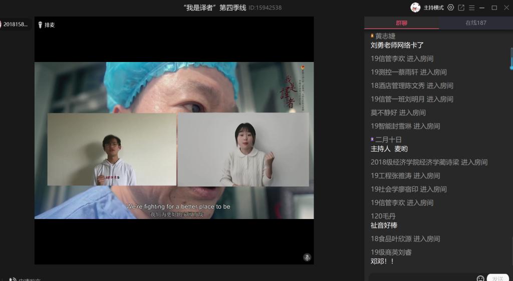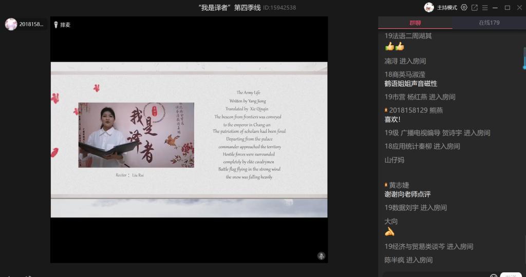 “我是译者”活动自2017年至今已连续开展四季,本次活动共收到全校各专业同学的作品300余件,最终评选出获奖作品24件。活动伊始,开场视频向观众们呈现了数百年来为中华民族独立、为新中国建设而做出贡献的英雄们,有“砍头不要紧,只要主义真”的夏明翰;有四川木里火灾救援牺牲的消防战士;有抗击新冠肺炎疫情的医护人员……本次活动旨在通过诗词表达对英雄的歌颂和赞美。