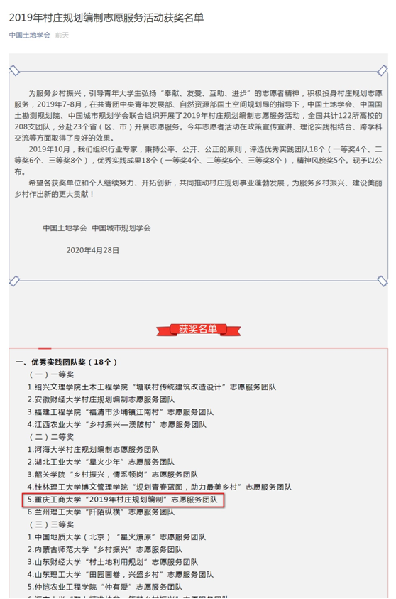 近日,中国土地学会公布了“2019年村庄规划志愿服务全国大学生暑期社会实践专项行动”的获奖名单,金年会旅游与国土资源学院“2019年村庄规划编制”志愿服务团队荣获优秀实践团队二等奖。这是继2018年荣获全国优秀实践成果一等奖以来,旅游与国土资源学院实践团队第二次获得同类奖项,团队获奖作品由人文地理与城乡规划系专业教师郑凌予、蒲海霞,土地资源管理系专业教师鄂诗璇和辅导员胡菡共同指导。
