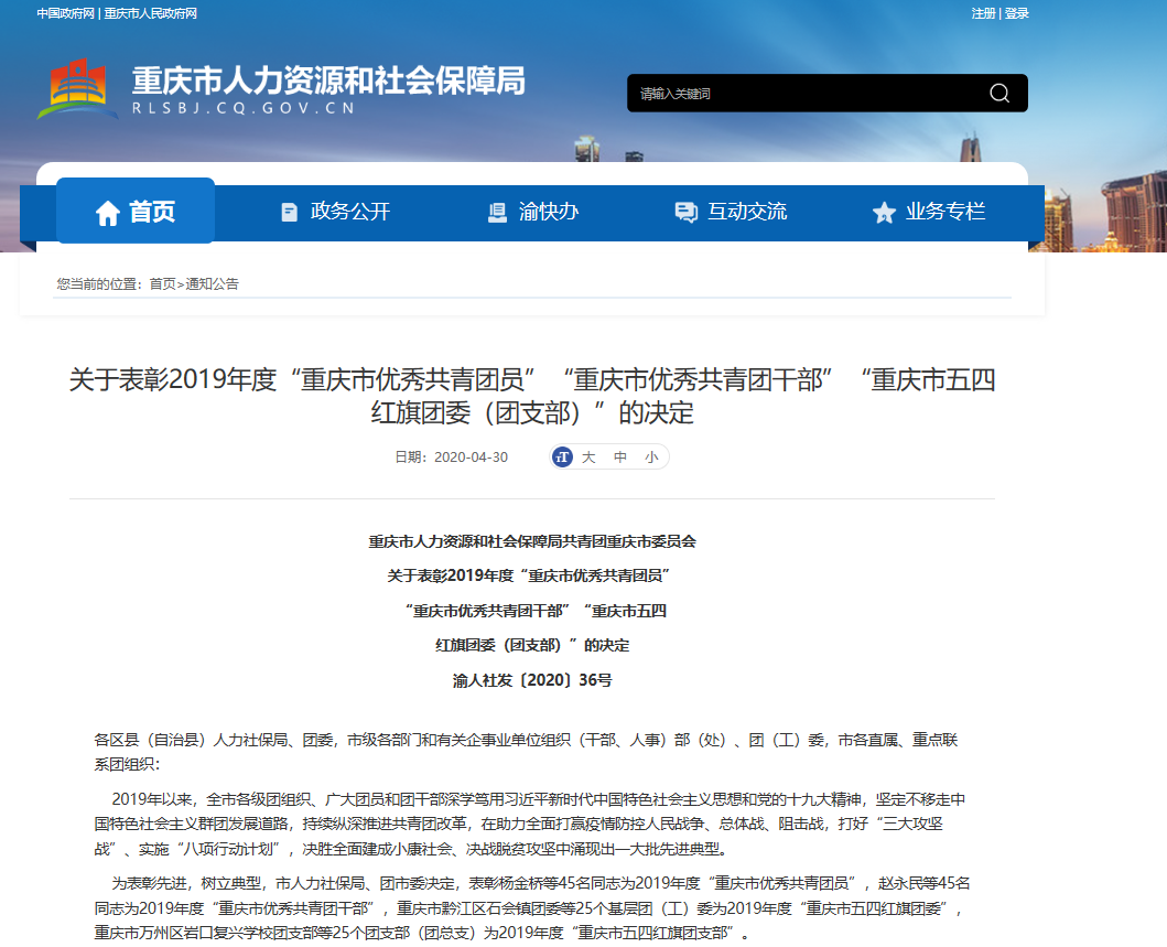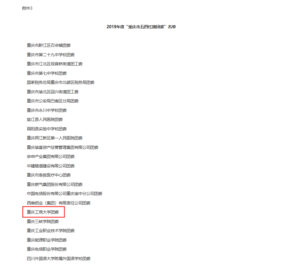 4月30日,重庆市人力资源和社会保障局共青团重庆市委员会发布《关于表彰2019年度“重庆市优秀共青团员”“重庆市优秀共青团干部”“重庆市五四红旗团委(团支部)”的决定》。其中,金年会获评2019年度“重庆市五四红旗团委”(全市共评选25个基层团(工)委)。