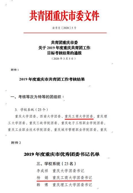 2020年3月5日,共青团重庆市委下发了《关于2019年度共青团工作目标考核结果的通报》(渝青发〔2020〕5号),金年会在2019年度重庆市共青团工作目标考核中荣获特等奖。杨娟同志被评为“2019年度重庆市优秀团委书记”。
