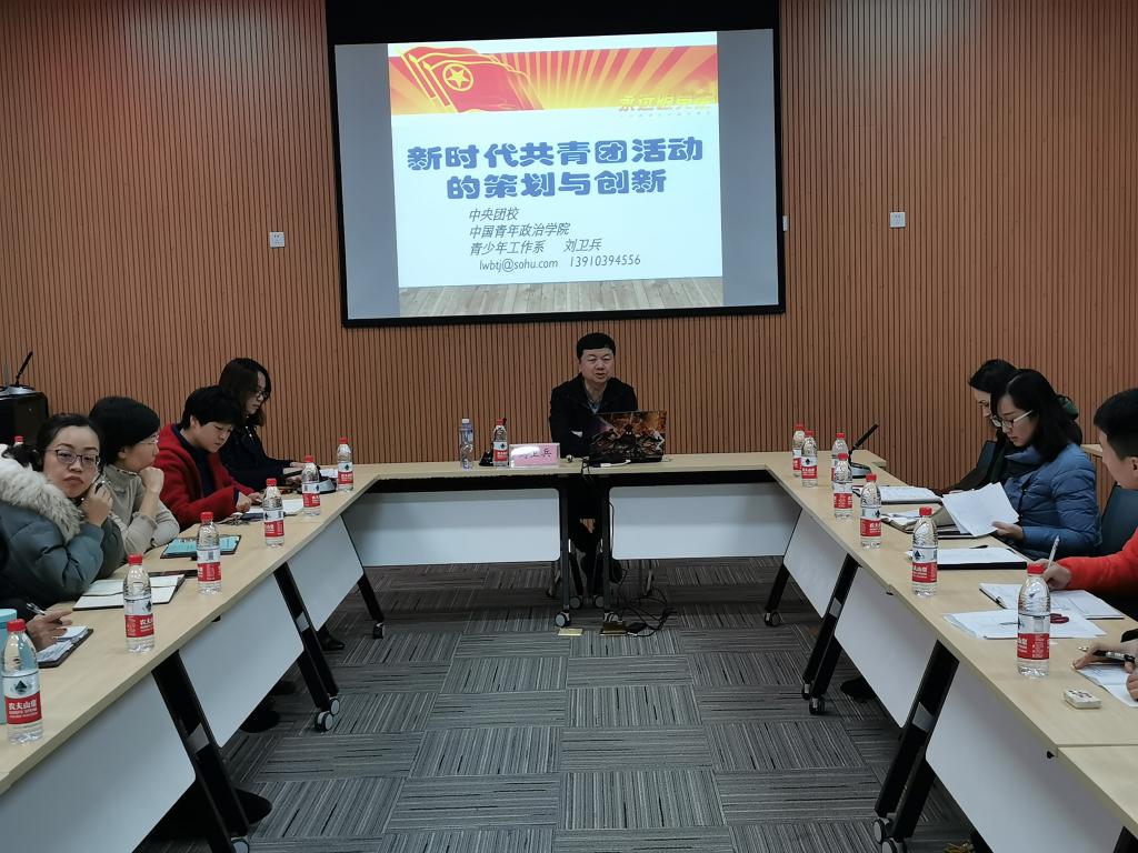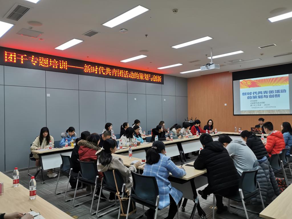 为深学笃用习近平新时代中国特色社会主义思想和学习贯彻党十九大精神,夯实“不忘初心、牢记使命”主题教育的思想基础和行动基础,巩固团务知识,建设一支积极向上、充满活力、坚强有力的团干队伍,做好青年学生“知心人”“热心人”“引路人”,12月5日下午,金年会团委举办了团干专题培训,中央团校、中国青年政治学院刘卫兵教授做了《新时代共青团活动的策划与创新》,金年会全体团干参与了此次培训。