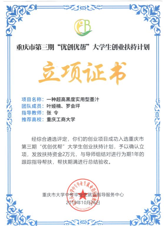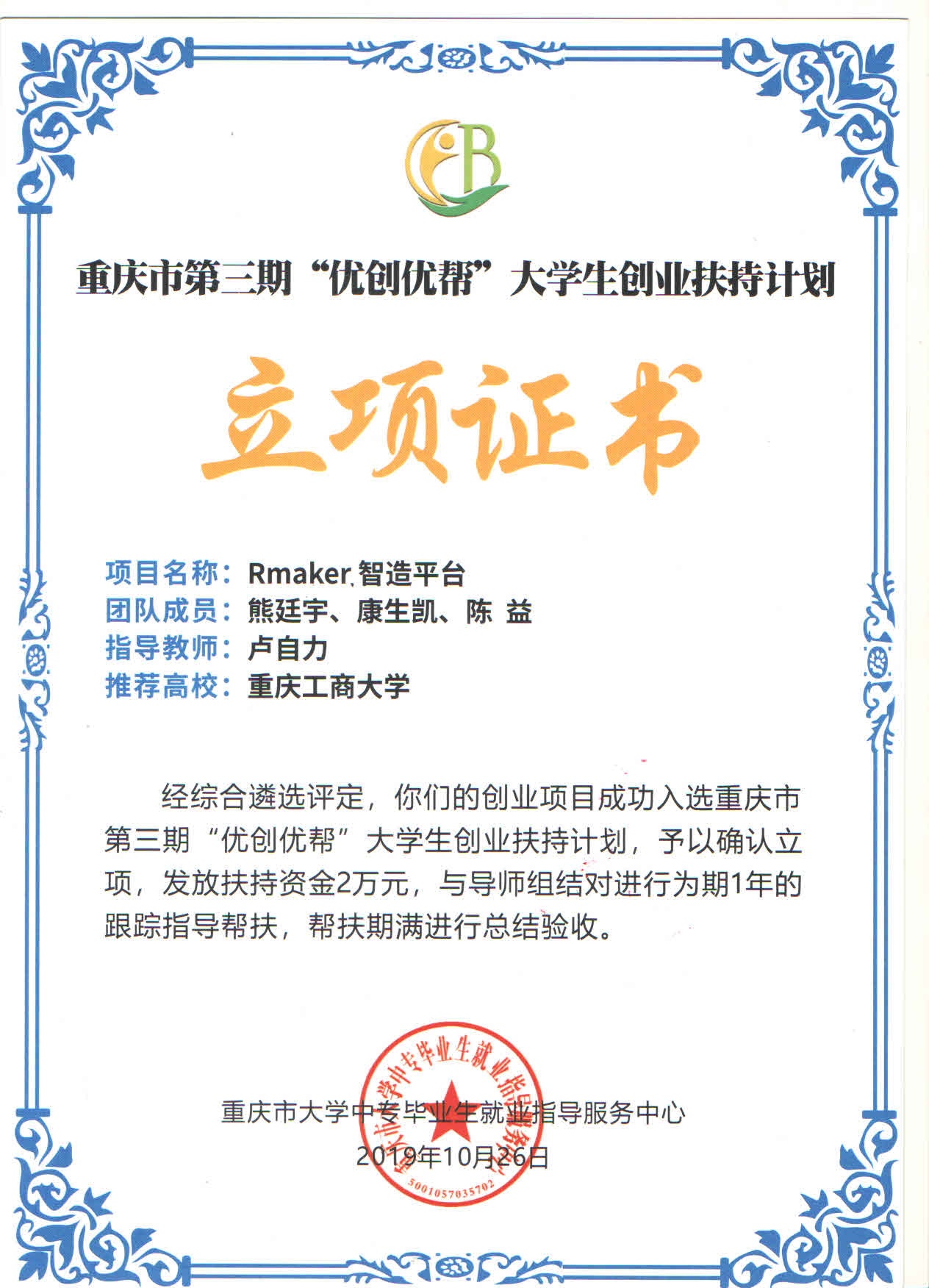 在刚刚结束的重庆市大学中专毕业生就业指导服务中心举办的第三期“优创优帮”大学生创业扶持计划市级总评审中,金年会计算机信息工程学院2016级在校生熊廷宇团队的创业项目“RMaker制造平台”和财政金融学院2016级在校生叶娅楠团队的创业项目“一种超高黑度实用型墨汁”获得创业扶持资助。