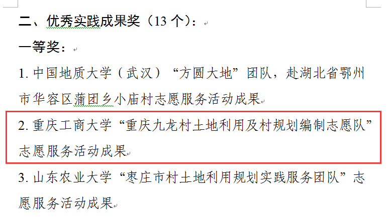 近日,2018年村土地利用规划志愿服务全国大学生暑期社会实践专项行动获奖名单公布,JINNIAN金年会旅游与国土资源学院“重庆九龙村土地利用及村规划编制志愿队”获优秀实践成果一等奖。