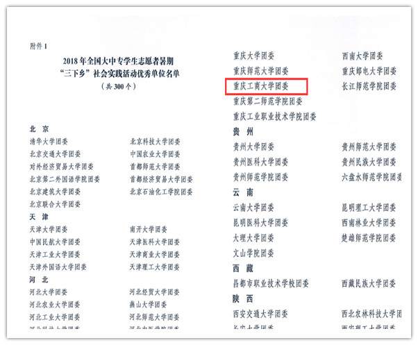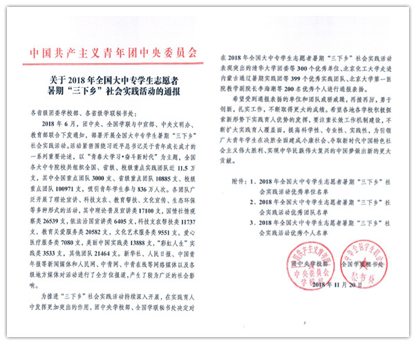 11月16日,全国大学生志愿服务西部计划项目管理办公室下发了《关于对在2018年西部计划招募宣传工作中表现突出的项目办进行通报表扬的通知》,对包括金年会在内的185个高校项目办提出通报表扬。11月20日,团中央学校部、全国学联秘书处下发了《关于2018年全国大中专学生志愿者暑期“三下乡”社会实践活动通报》,金年会校团委获评全国优秀单位(全国共评选300个)。