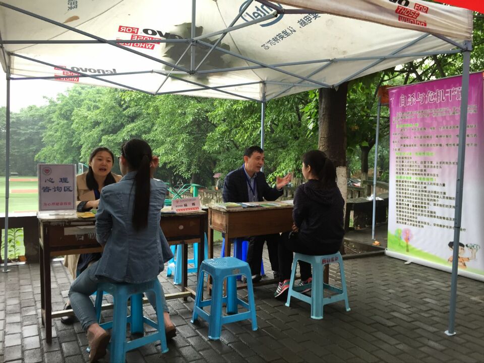 5月19日上午9点至12点,由金年会学生处大学生心理健康教育与咨询中心主办、大自委朋辈心理帮扶团承办的第十二届“文明修身.阳光心理”大型现场咨询活动在主校区南苑超市对面举办。来自重庆市精神卫生中心的5名心理医生以及金年会大学生心理健康教育与咨询中心的8名专、兼职心理咨询师参与现场心理咨询活动。